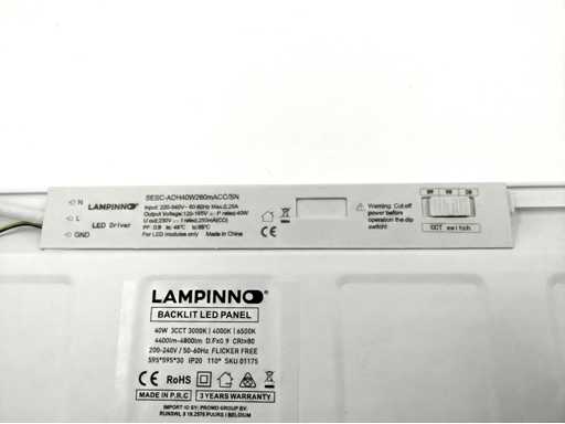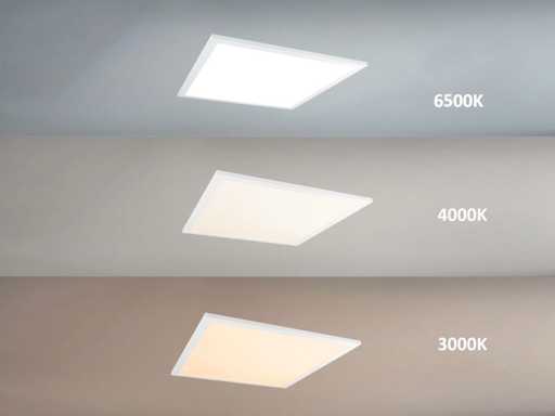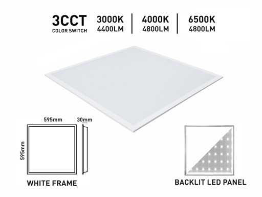 lichtstroom 4400-4800 lumen, flikervrij, lichtkleur 3 in 1 CCT switch warm wit neutraal wit en daglicht dat de kleurtemperatuur kan geschakeld worden tussen 3000K 4000K 6500K, afdichting IP20, stralingshoek 110°, product kleur mat wit, afm. 595 x 595 x 30 mm, materiaal ijzer en PC, bevestigingsset niet inclusief, levensduur 25.000 uren, voltage 220-240V, SKU 1175
