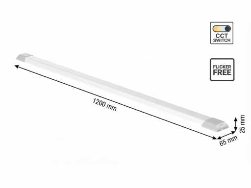 lichtstroom 4800 lumen, lichtkleur 3 in 1 CCT switch warm wit neutraal wit en daglicht dat de kleurtemperatuur kan geschakeld worden tussen 3000K 4000K 6500K – afdichting IP20, product kleur wit, flicker free – stralingshoek 110°, afm. 1200 x 65 x 25 mm, materiaal PC, bevestigingsset inclusief, levensduur 25.000 uren, voltage 165-265V, garage licht magazijn licht kantoor licht, sku 1179
