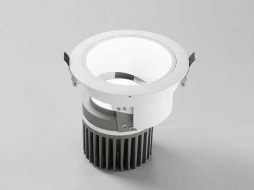 Professionele led downlighters geschikt voor alle zakelijke en commerciele ruimten, voorzien van een 30 Watt led lichtbron, ook geschikt gebruik in hogere plafonds. De armaturen geven natuurlijk wit licht, zijn kantelbaar en zullen in iedere ruimte direct een goede licht uitstraling geven. Snelle montage dankzij direct fit klemsysteem en geintegreerde led driver Type: INC-ELITE-1X30M / 8031440363327 Inbouwspots, Lichtbron: inbegrepen, 30 Watt led. Lumen: ca 2400 Lm. Lichtbundelbreedte 40 graden. Lichtkleur: 4000K. Kantelhoek 45 graden. Afmetingen ca 16,5 x 16 cm, IP23. Conditie: nieuw.Lotwaarde: € 7536,-