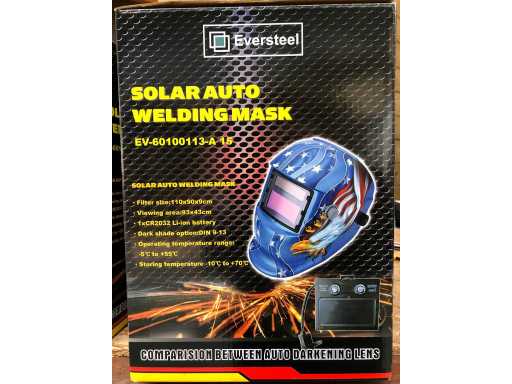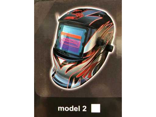 Lashelm model 2. Deze automatische laskap is geschikt voor alle las processen. Kijkvenster afmeting circa 93x43 mm met UV- en IR-bescherming. Schakelt automatisch uit. Verduisteringsgraad traploos vanaf de buitenkant instelbaar van DIN 9 - 13. Inschakelsnelheid filter: 1/25000 seconde, van licht naar donker. Reactie tijd filter 0.6 seconde, van donker naar licht. Volledig verstelbaar hoofdstel met wasbare zweetband. Werkt op zonnecellen en indien nodig op AAA batterijen, levensduur batterij circa 4000 uur, inclusief AAA batterijen. CE gekeurd.