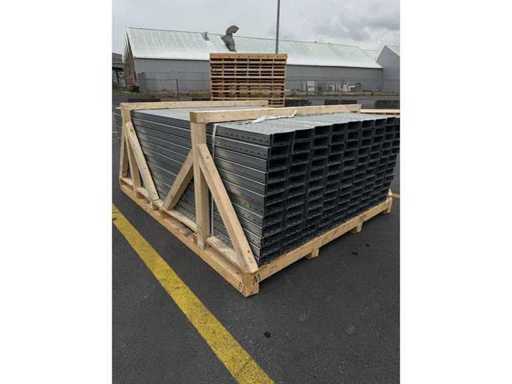 5 ton gestapelde gegalvaniseerde stalen vloerpanelen gebruikt voor industriële bouwvloeren. De panelen zijn netjes op een houten pallet geplaatst, klaar voor installatie of transport. Deze elementen worden doorgaans gebruikt als dragende componenten in mezzanines, fabrieksvloeren of verhoogde platforms, en bieden sterke en duurzame ondersteuning voor zware industriële toepassingen. Op de achtergrond zijn verschillende grote transportkisten te zien in een magazijnomgeving. Per paneel: LANG- 3M HOOGTE - 75MM BREEDTE - 0,20M GEWICHT - 23,2 KG