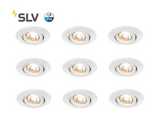 SLV Easy install Led spots, geschikt voor zowel droge als vochtige ruimtes zoals woonkamers, keukens, badkamers of buiten. De armaturen zijn dimbaar en voorzien van een energiezuinig led lampje en kunnen op eenvoudige wijze zowel voor hoofdverlichting als sfeerverlichting zorgen. Inbouwhoogte 3.2 cm SLV type: 1001590, Model: EASY-INSTALL SLIM LED, Afmetingen: 8.7 cm. Uitsparing 7.5 cm, Kantelbaar: Ja. Lichtbron, ja, Led. Lichtkleur: 3000K, Lichtsterkte: 6.2 Watt. Kleur: Wit. Spatwaterdicht: Ja, IP44. Dit betreft een volledig nieuw product. Lotwaarde € 2760,-