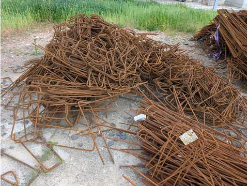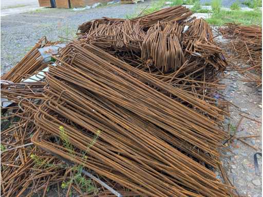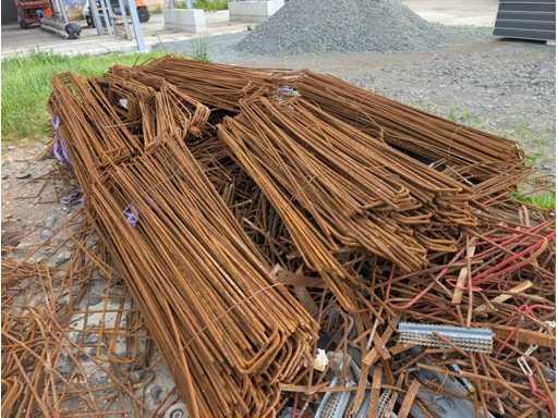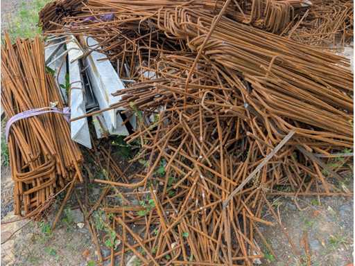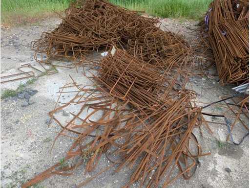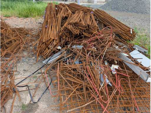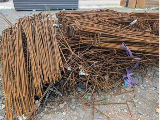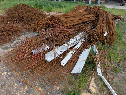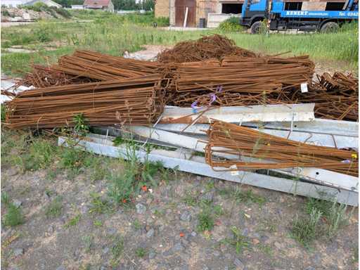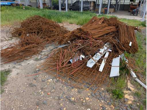 Een perceel met naar schatting 8000 kg constructiestaal, alles past in een grote roll-off container; Er zijn een heftruck en wiellader beschikbaar voor het laden.