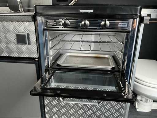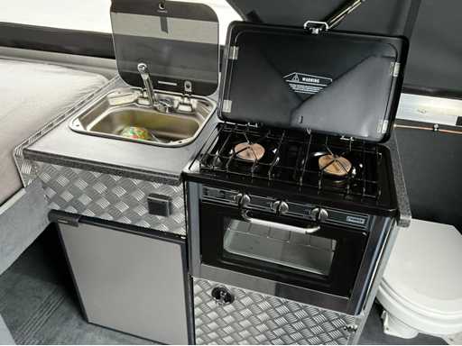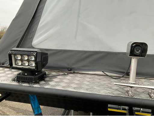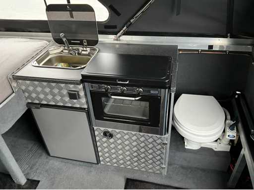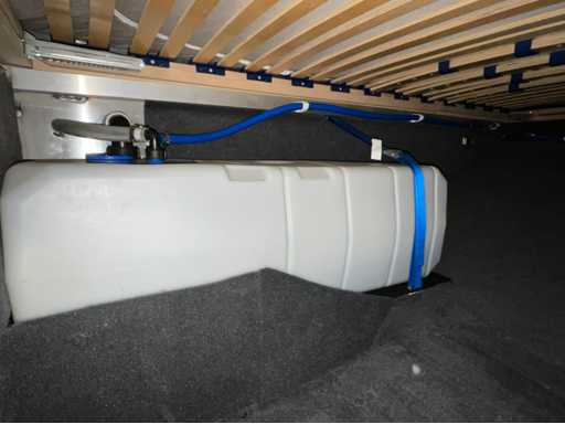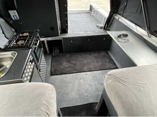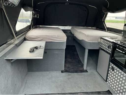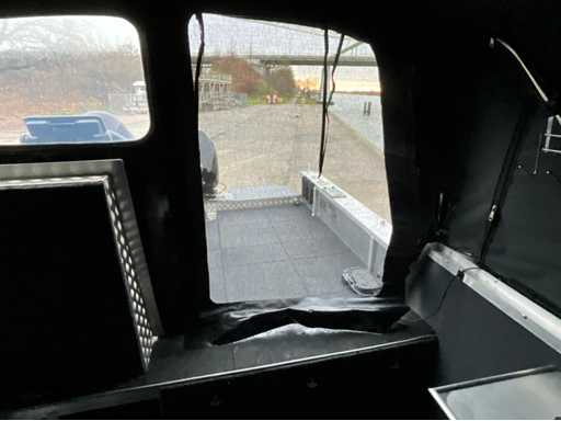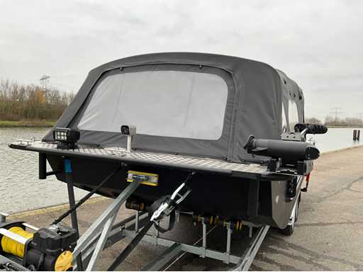 Custom made bootkap met volledig verduisterbare ramen en vliegenhorren. Zeer veel opbergruimte onder de vloer.