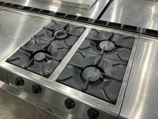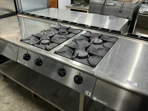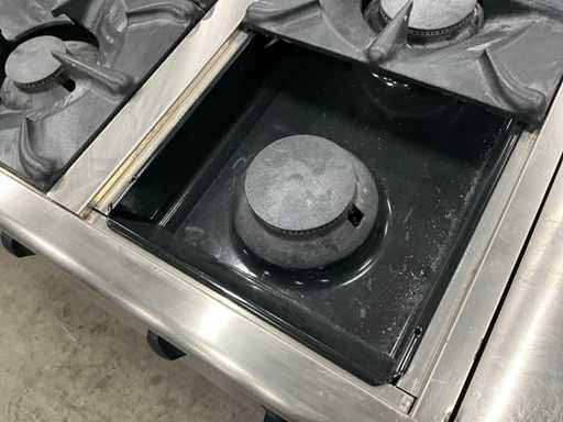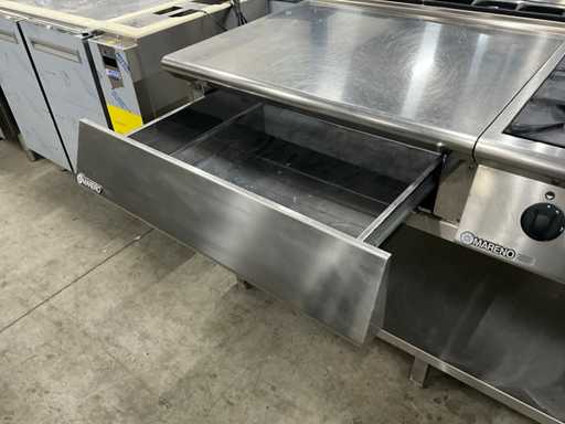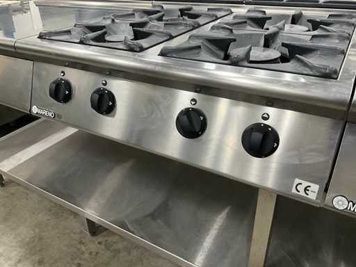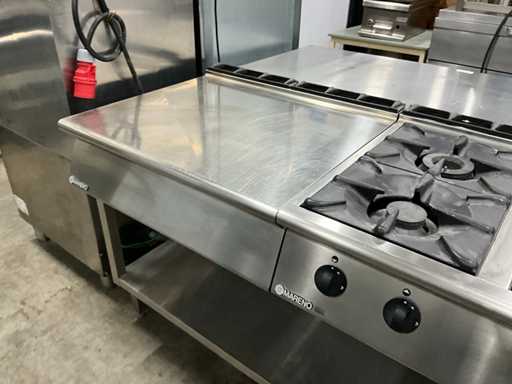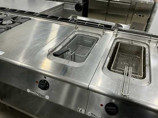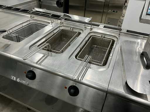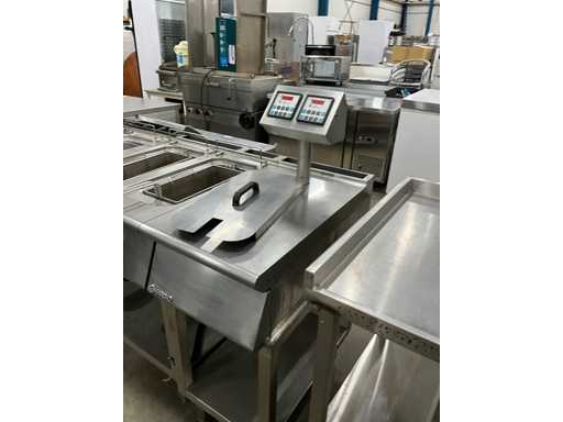 voorzien van 4-pits gasfornuis en 3x elektrische friteuse; waarvan 2 x met snackcomputter ; 4 x neutrale unit met lade.