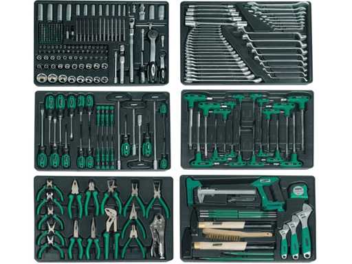 6 gevulde gereedschapslades geschikt voor in verschillende gereedschapwagens. Afmetingen: 54 cm x 39,5 cm x 4,3 cm .10 jaar garantie-TUV/GS gekeurd gereedschap.