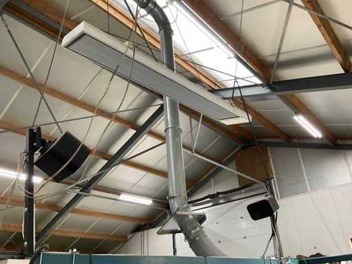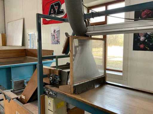 mobiel; elevator bandlengte ca. 1250 mm; bandbreedte ca. 450 mm; opvoerhoogte ca. 1300 mm; bunker afm. ca. 1500x1500 mm; leesband afm. ca. 2200x560 mm; 230V; incl. blaasmond en warmtelamp