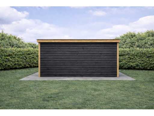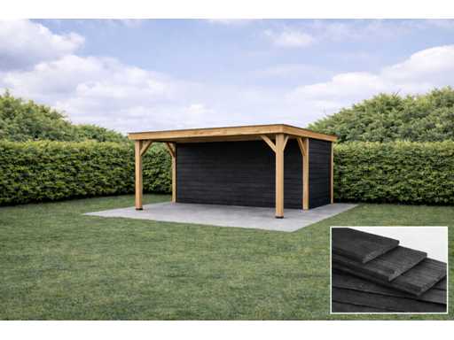 De constructie bestaat uit robuuste houten palen en schoren, ontworpen voor stabiliteit en duurzaamheid. Dankzij de gesloten achter- en zijwand biedt de overkapping privacy en beschutting tegen zon en wind. Het strakke platte dak en de natuurlijke materialen zorgen voor een tijdloos ontwerp dat past bij zowel moderne als landelijke tuinen.