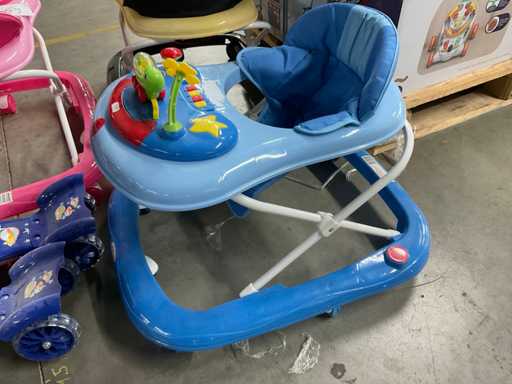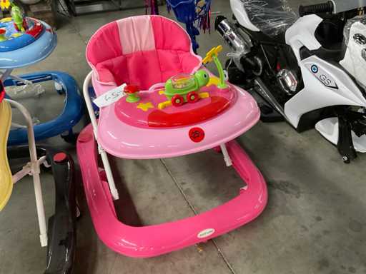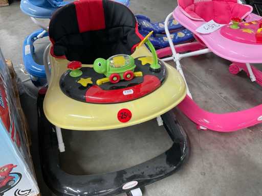 -loopkarretjes in de kleur roze, blauw en zwart met geel.