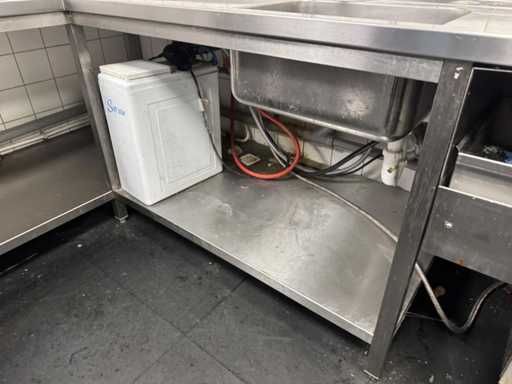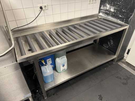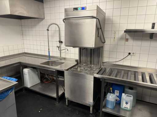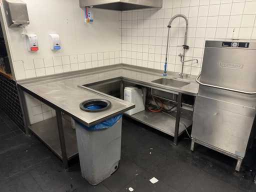 V.v. spoeltafel met voorspoeldouche en afvalstort, rollenbaan korvenafvoertafel, Lubron Softstar waterontharder, en dampkap. Reeds professioneel gedemonteerd en zorgvuldig getransporteerd naar de afhaallocatie. LET OP! Voor bovenstaande kunnen additionele kosten van toepassing zijn.