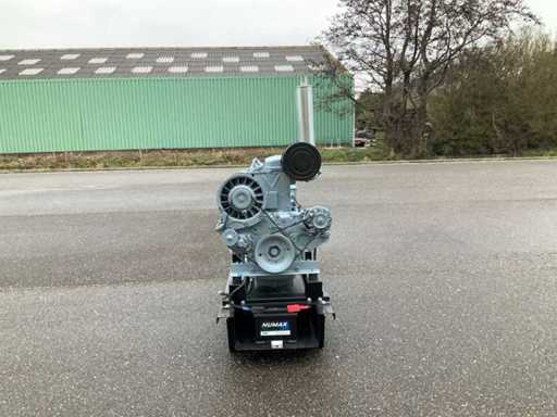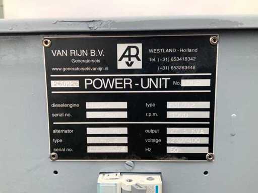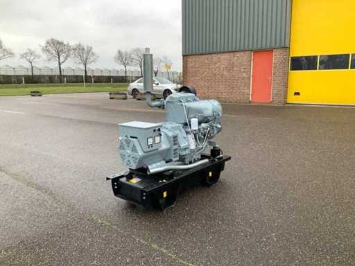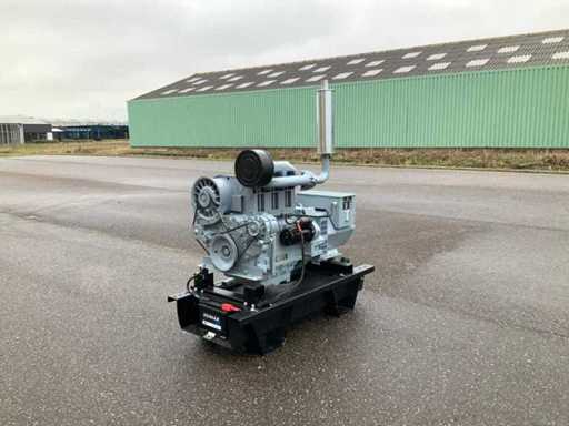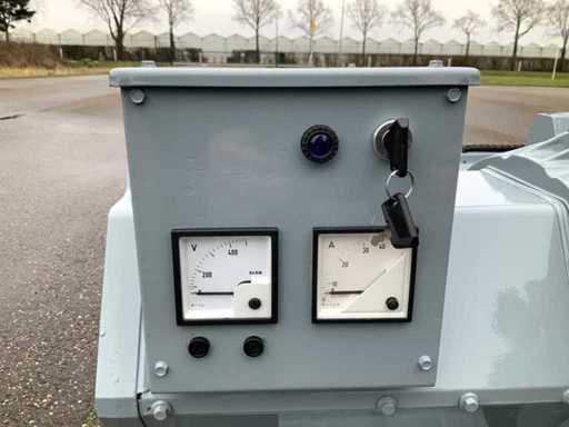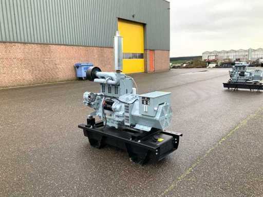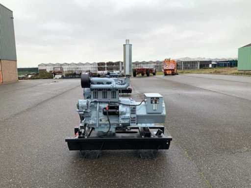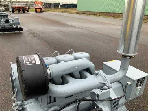 Set is gebouwd op tankfundatie met een inhoud van 70 liter, generator is ongebruikt, spanning 230/400 volt, elektrisch gestart met nieuwe accu en is met volle belasting getest en verkeerd in goede staat.