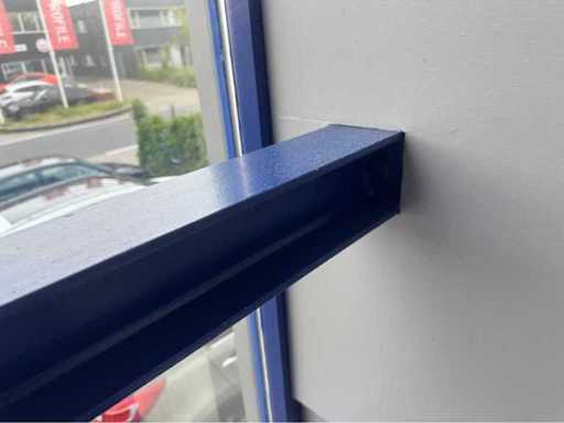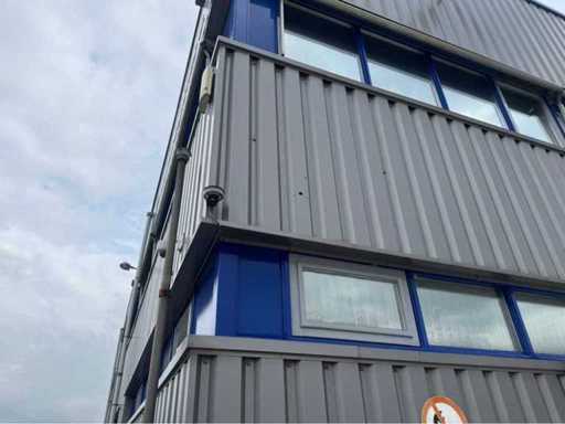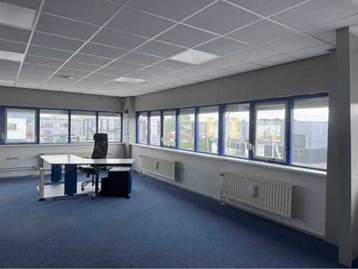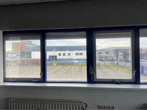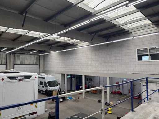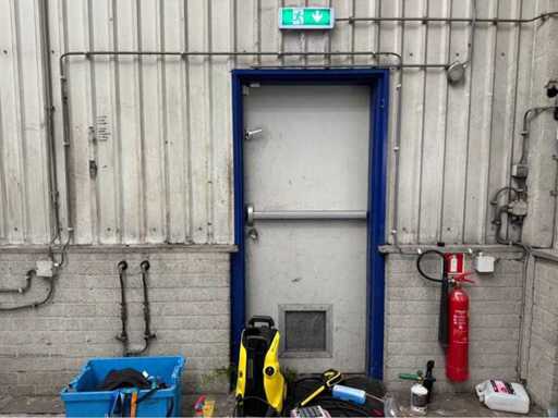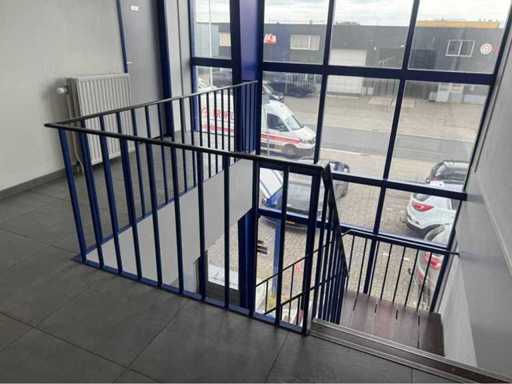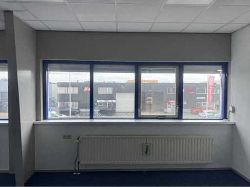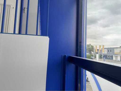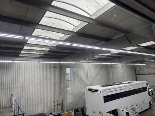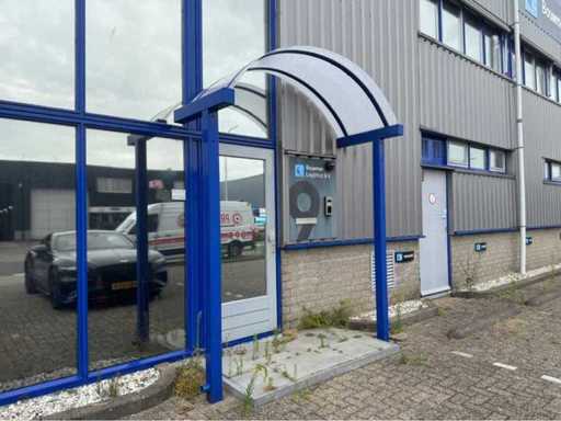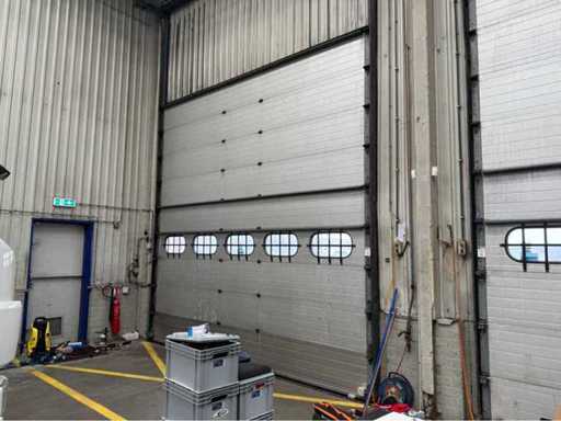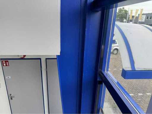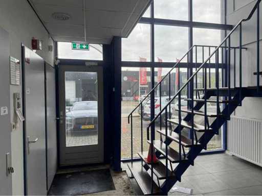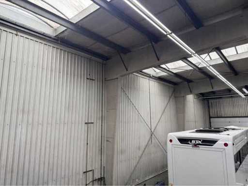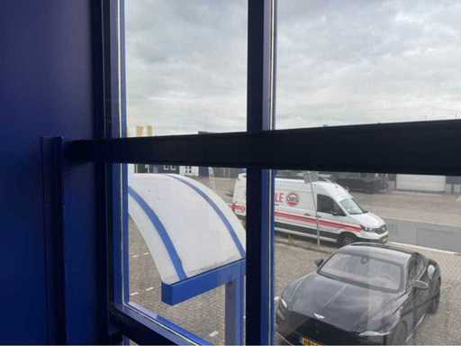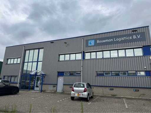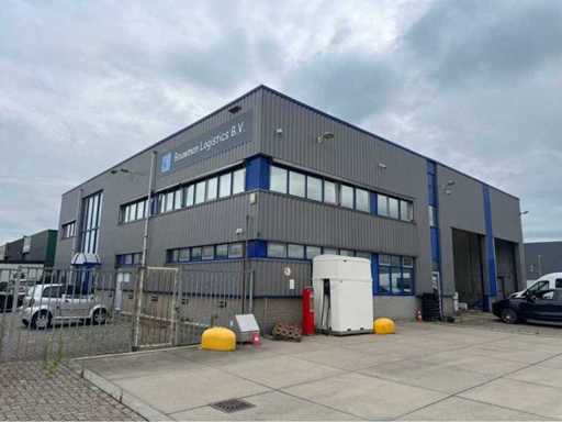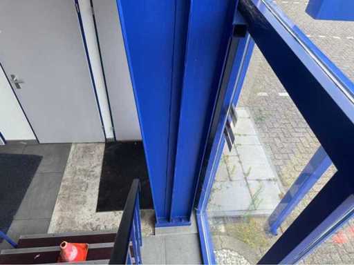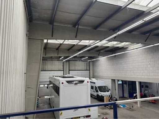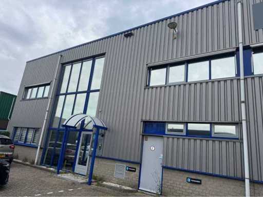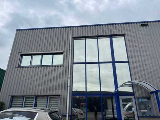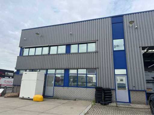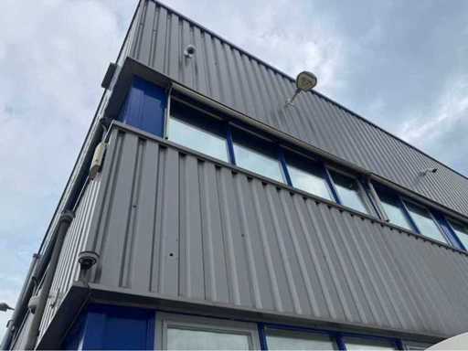 Zwart gecoate staalconstructie; poothoogte 7500 mm; totale breedte 23000 mm; totale lengte 25000 mm; 2 overheaddeuren van 4550 mm breed en 4600 mm hoog; dak met 3 lichtkoepels; 1 nooddeur van 2200 mm hoog en 1000 mm breed; dak en gevels zijn geïsoleerd; met kleine entresol van ca 30 m2; met 2 trappen; kozijnen met ramen die open kunnen; met Remeha ketel installatie; wordt gedemonteerd en transport klaar gemaakt door verkoper; kijkdag en afhalen op afspraak; laden in overleg; februari / maart;