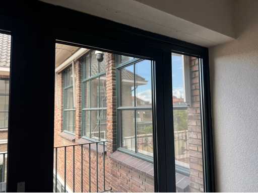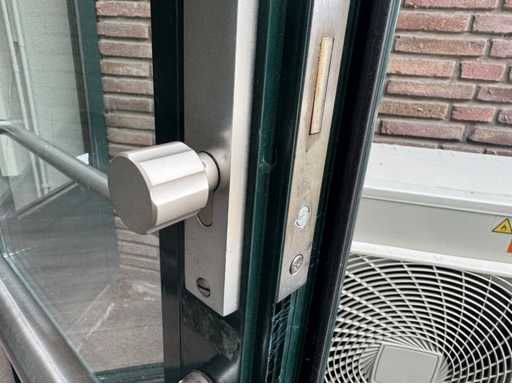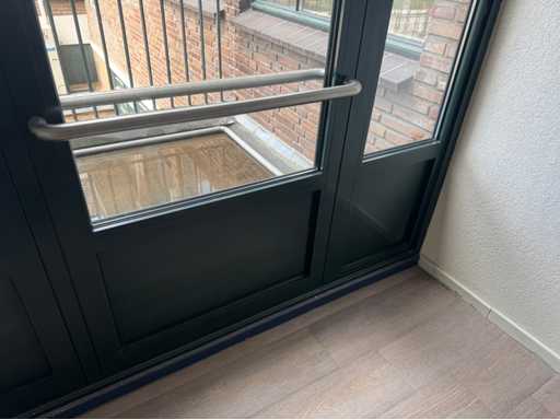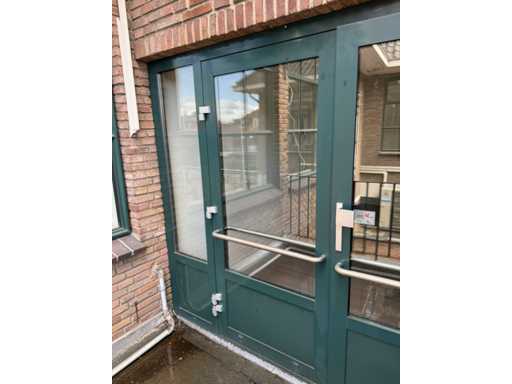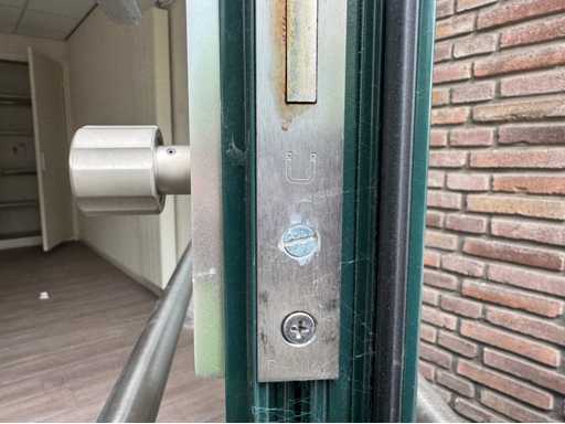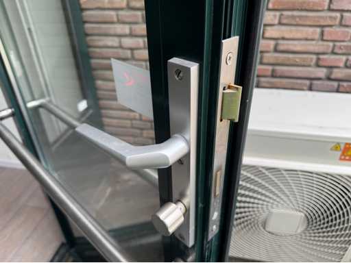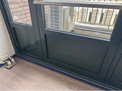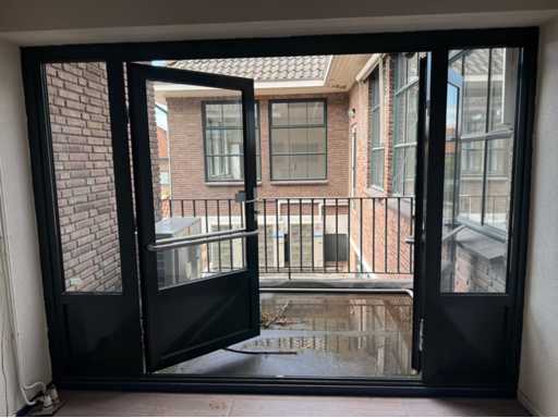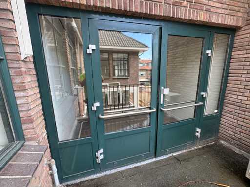 Groen gepoedercoat kozijn; 1 deur is 850 mm mm breed; wordt gedemonteerd en transport klaar gemaakt door verkoper; kijkdag en afhalen op afspraak; afhalen eind februari / maart;