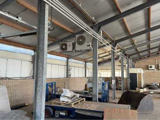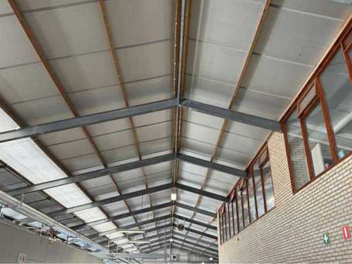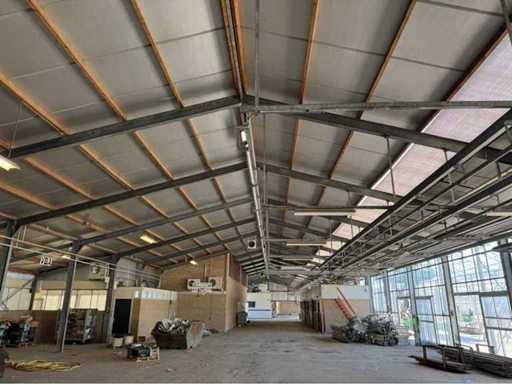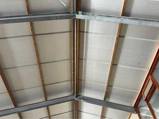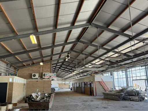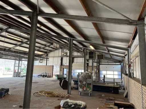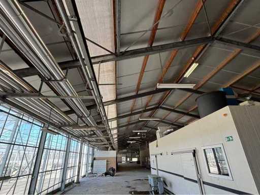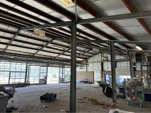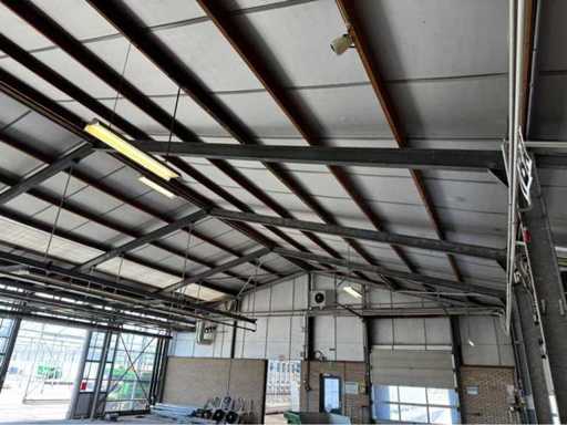 Gegalvaniseerde staalconstructie; staanders en spanten zijn IPE 240; deze constructie bestaat uit; staanders, spanten, goten, houten dak gordingen, dupanel isolatie platen voor het dak; 4 stuks overhead deuren; poothoogte ca 4300mm; breedte ca 16000mm; lengte ca 75000mm; constructie wordt door verkoper gedemonteerd en transport klaar gemaakt; bezichtiging en ophalen alleen op afspraak; LET OP beschikbaar ca eind Mei; ivm demontage; tevens zit er een kleine aanbouw bevestigd aan deze constructie die ook inclusief is; is eenvoudig te demonteren dus gewoon bruikbaar