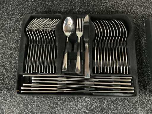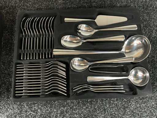 Voorzien van roestvrij staal; harde opbergkoffer met cijferslot; 12× tafelmes; 12× tafellepel; 12× tafelvork; 12× theelepel; 12× gebaksvorkje; 2× opscheplepel; 2× vleesvork; 1× saladelepel; 1× saladevork; 1× soeplepel; 1× suikerlepel; 1× taartschep; 1× juslepel; 1× extra opscheplepel; 1× suikertang; geschikt voor vaatwasser; ongebruikt in koffer