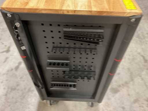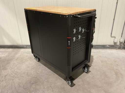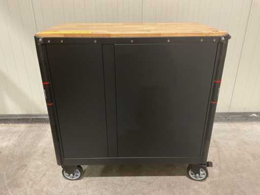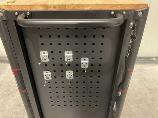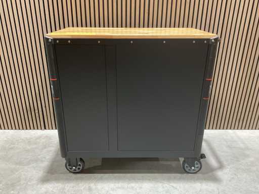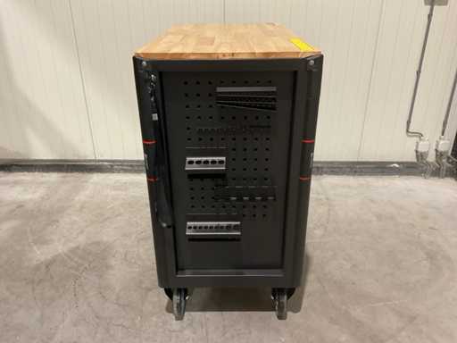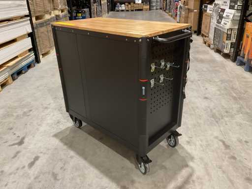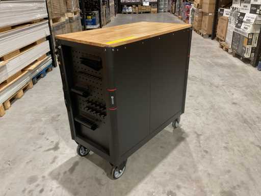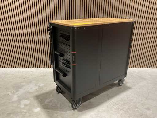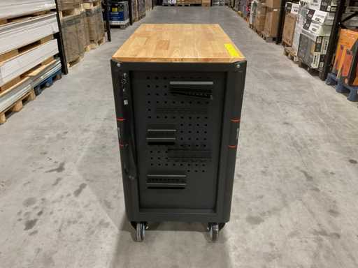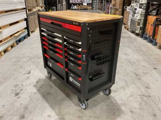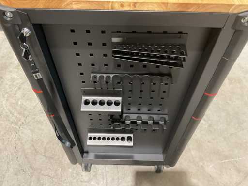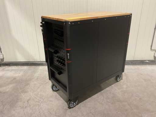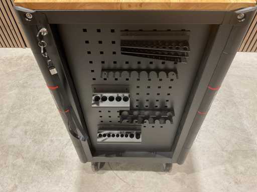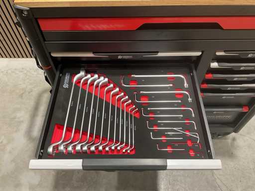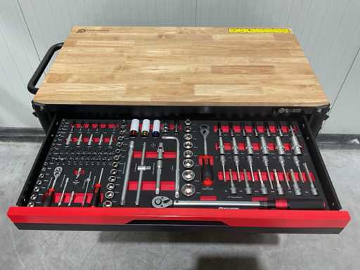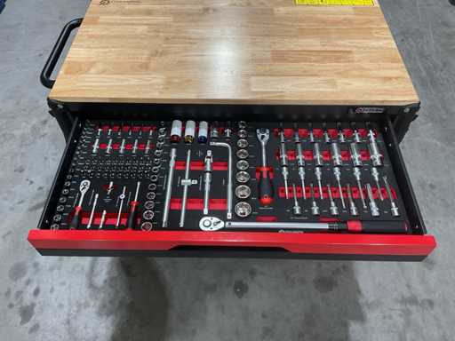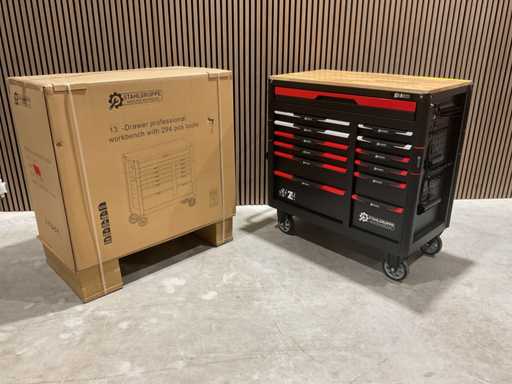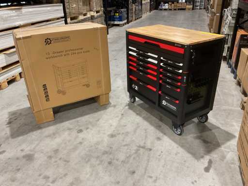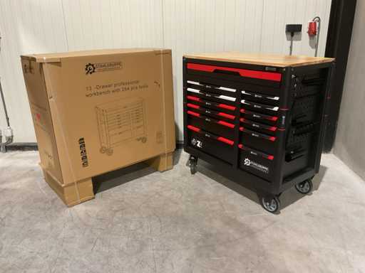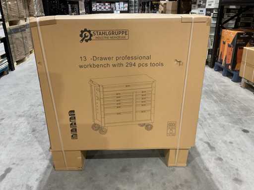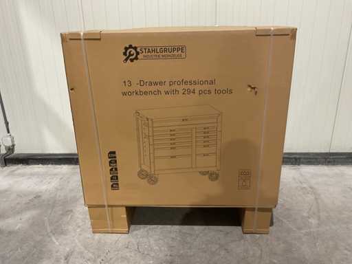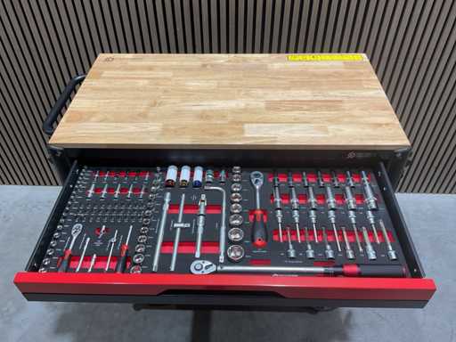 werkbank op wielen met werkblad; Aantal laden: 13; Aantal gevulde laden: 11; 294-delig, materiaal chroom-vanadium; houten werkblad; 2 delen afsluitbaar; 2× dopsleutelsets 1/2” & 1/4”; Momentsleutel 40–220 Nm; Ring-/steeksleutelsets (o.a. 6–32 mm), ringratel-steeksleutelset (8–19 mm); Inbus (1,5–10 mm), Torx (T8–T70); Schroevendraaiers (21 st.), tangen (9 st.); Schuifmaat 0–150 mm (0,02 mm); Beitels/pendrijvers (9 st.), hamers (3 st.); T-greep Torx (T15–T45), T-greep inbus (2–10 mm); Chroom-molybdeen krachtdoppen (10–24 mm); T-greep dopsleutels (7–14 mm); VDE-gereedschappen (10 st.), vijlen & hakenset (8 st.); L 112 × B 55 × H 110 cm, gewicht 152 kg; ongebruikt in doos