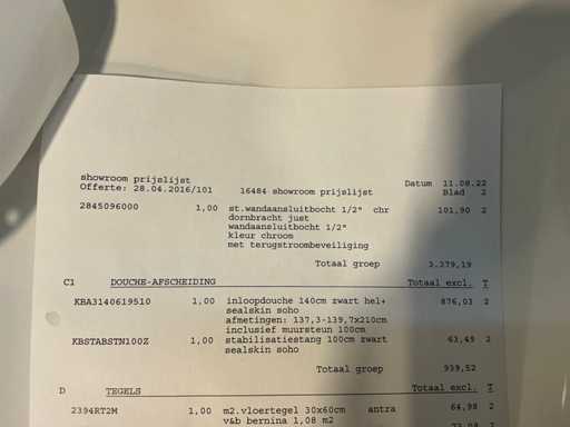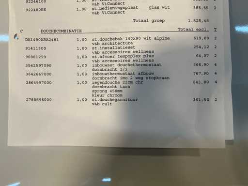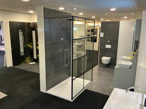 Bestaande uit een Sealskin Soho inloopdouche 140x210cm met muursteun en stabilisatiestang 100cm, Villeroy&Boch Architectura douchebak (140x90cm) Dornbracht afbouwdelen douchethermostaat, regendouche en handdouche zonder inbouwgedeeltes.