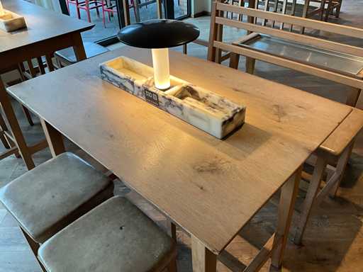 Bartafel met marmeren opbouw en verlichting. Afmeting bank: 120x50x112 cm, zithoogte 75 cm. Afmeting krukken 37x37x75 cm.