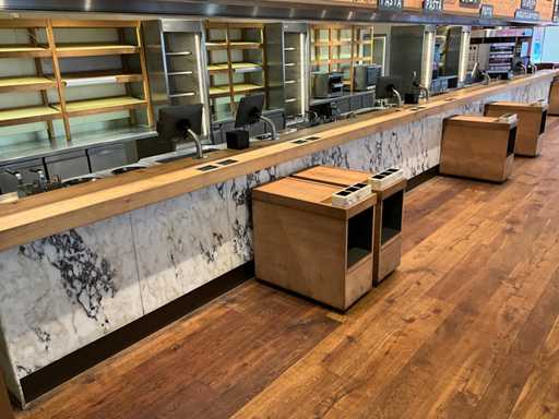 Deze kavel betreft een combinatiekavel van kavels 17 t/m 36; Voor beschrijvingen zie informatie bij desbetreffende kavelnummers. Complete frontcooking counter met ombouw en apparatuur.