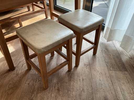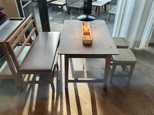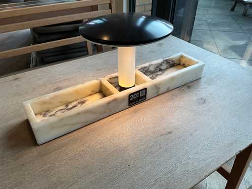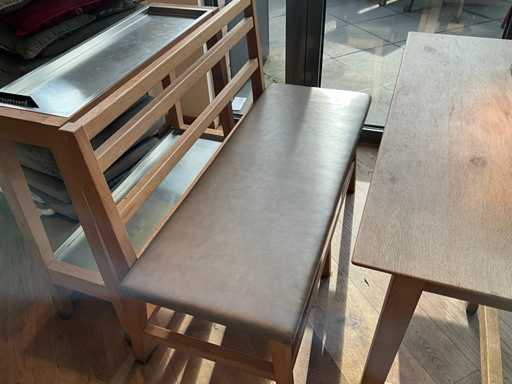 Restauranttafel met marmeren opbouw en verlichting. Afmeting bank: 120x50x90 cm. Zithoogte 50 cm. Afmeting krukken: 37x37x50 cm.