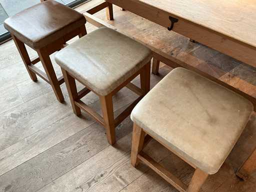 Restauranttafel met marmeren opbouw en verlichting. Afmeting bank: 180x50x90 cm. Zithoogte 50 cm. Afmeting krukken: 37x37x50 cm.