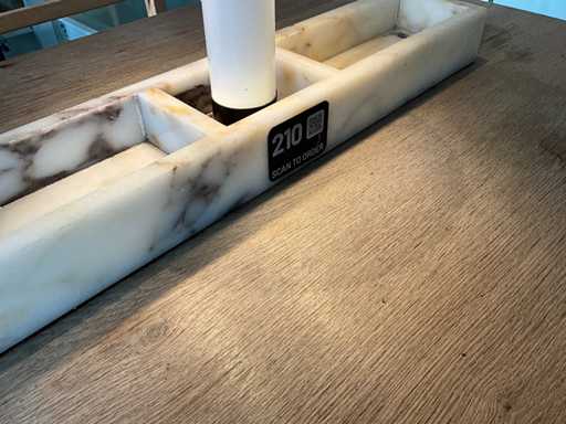 Restauranttafel met marmeren opbouw en verlichting. Afmeting bank: 120x50x90 cm. Zithoogte 50 cm. Afmeting krukken: 37x37x50 cm.