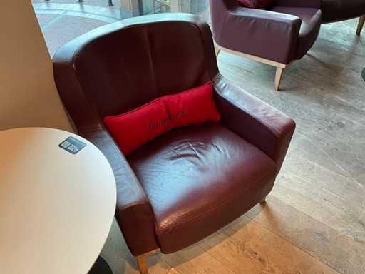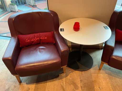 Afmeting tafel Ø 68 cm. Afmeting fauteuil 76x85x80 cm.