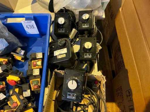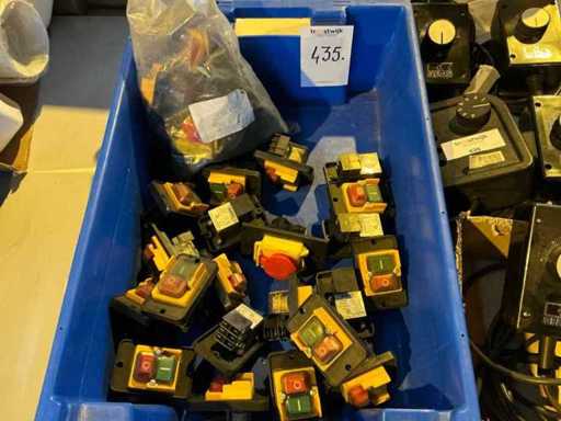5 vochtigeruimte thermostaten en een krat met noodstopschakelaars.