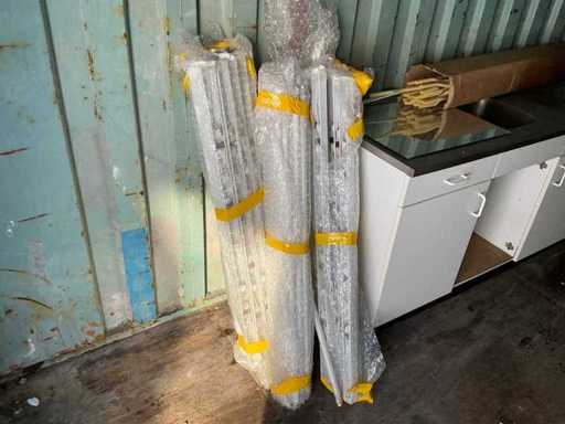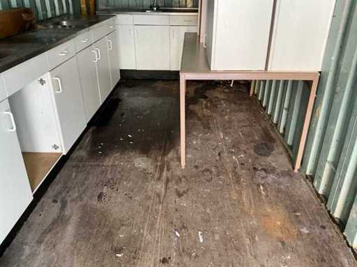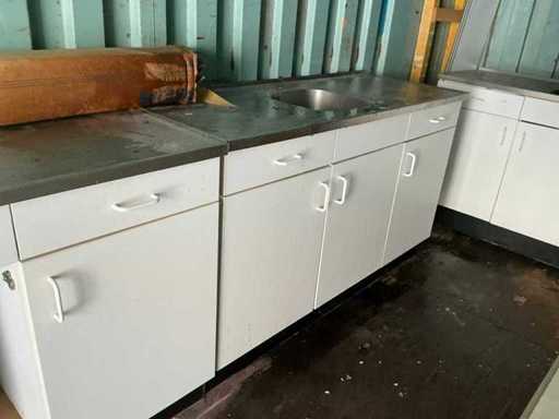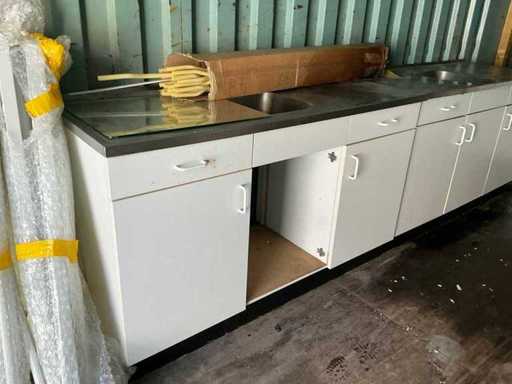 Voorzien van 3 keukenblokken met wasbakken, 6 keukenkastjes, een tafel en tl verlichting behuizing.