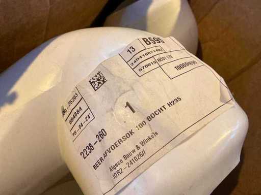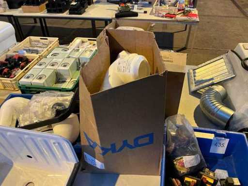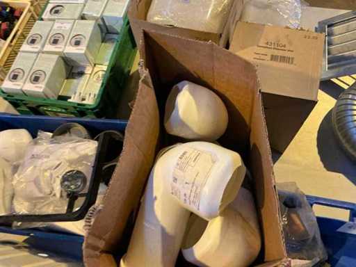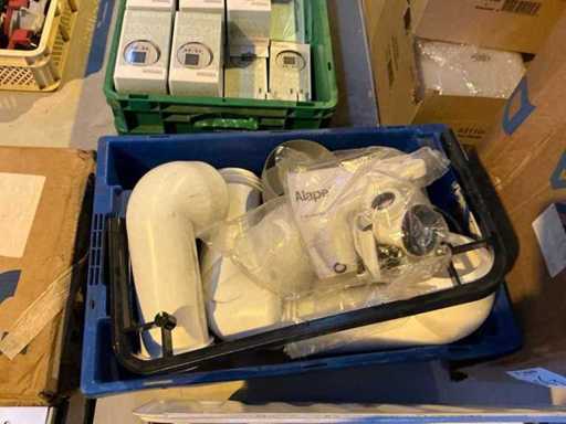 Voorzien van een krat en een doos met verschillende soorten en maten afvoerbuizen.