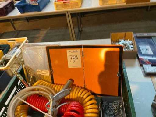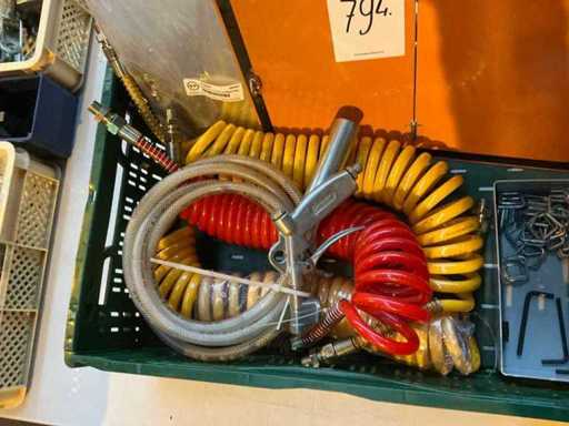 Verschillende soorten en maten in en met plastic krat waaronder luchtgereedschap, ADR bordjes.