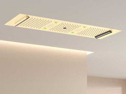 bluetooth met speakers, materiaal messing en 304 rvs, smart control thermostaatkraan met 5 drukknoppen en 2 regelknoppen, binnenwerk keramisch, douchekop 90x30 cm met 5 functies uit 304 rvs en ingebouwde ledverlichting, handdouche verstelbaar met doucheslang en messing ophanging, douchekop met vernevelaars + waterval + sproeiers + 3 regendouche zones, afstandsbediening voor kleuren regeling, kunststof wateruitlopen om gemakkelijk kalkaanslag te verwijderen, alle water functies kunnen allemaal tegelijk of onafzonderlijk gebruikt/geregeld worden