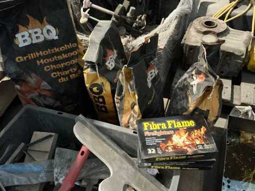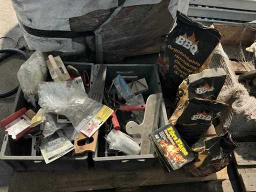 Waaronder stukadoorsmessen, glasblokkruisjes, handzaag, bijenbekjes, kozijnankers en cellenbetonrasp, Compleet met 4 zakken houtskool waaronder 3x 2kg en 1x 5kg en 3 pakken aanmaakblokjes, Liggende op 1 pallet