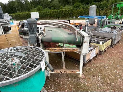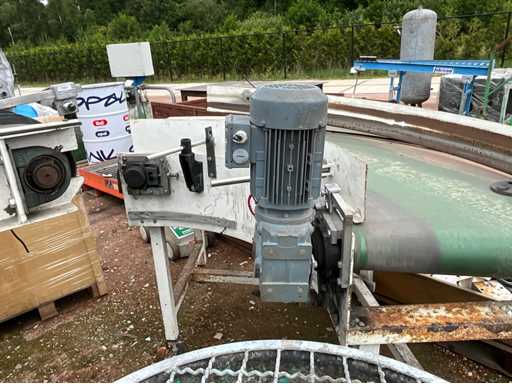 1/4 rond; gemonteerd op profielstaal onderstel en frame; voorzien van verstelbare geleiderail binnen en buitenzijde; aangedreven door externe elektro motor; 400 Volt;