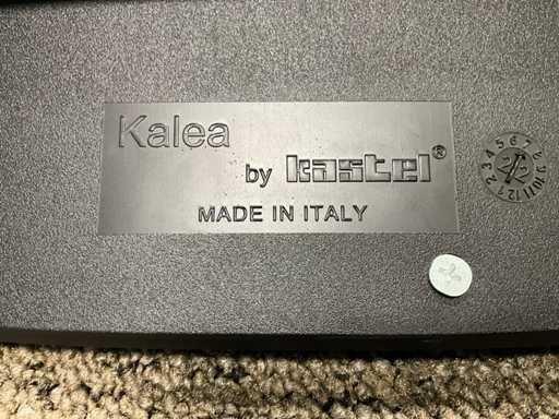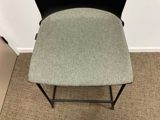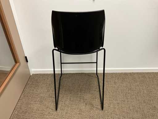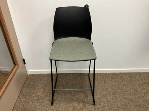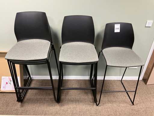 Stapelbaar; voorzien van kunststof gestoffeerd zitgedeelte en metalen frame