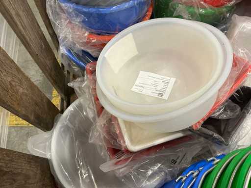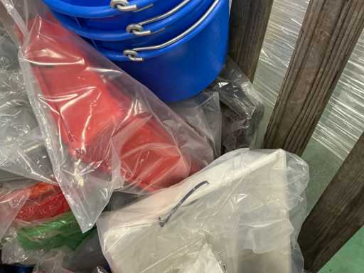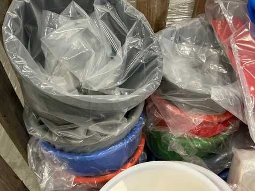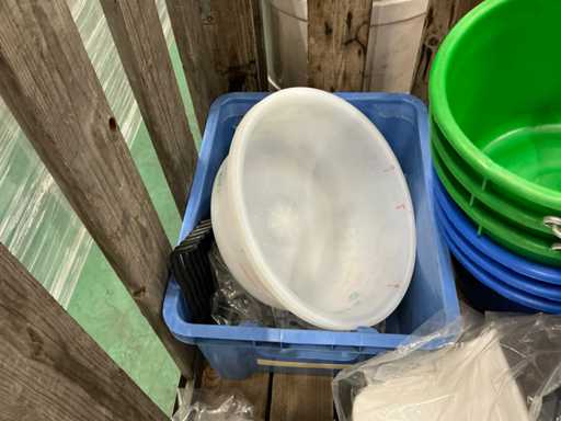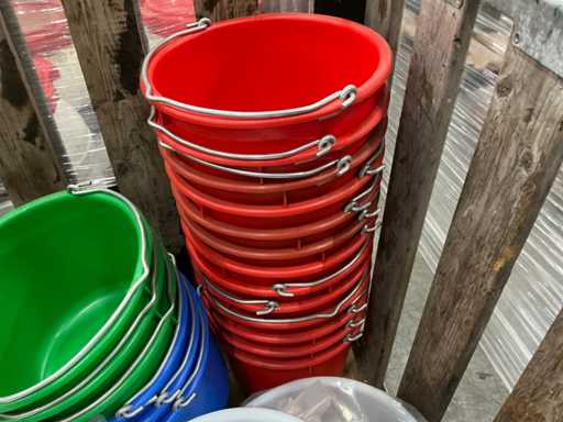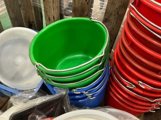 Circa 46 stuks diverse modellen en kleuren emmers en kunststof kratten; let op kavel wordt verkocht zonder palletbox.