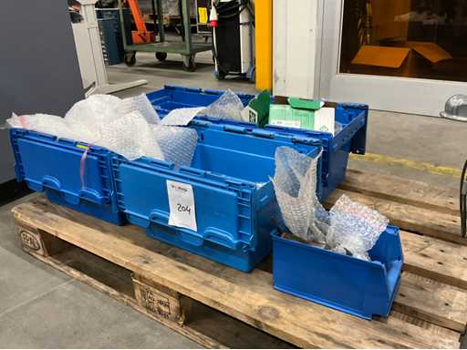 In 4 magazijnbakken, bestaande uit onder andere tandwielen, bevestigingsmaterialen, en divers