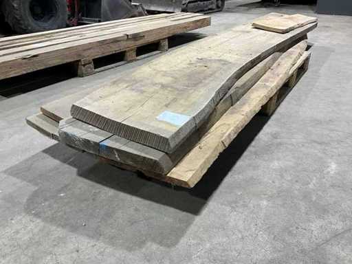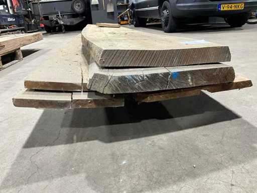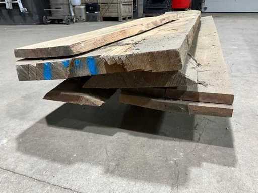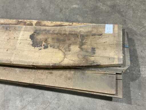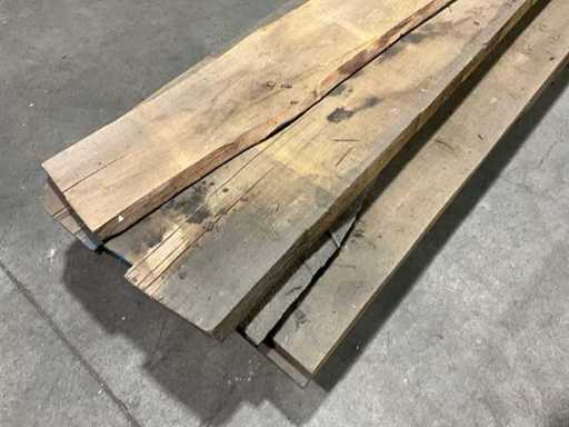 Diverse afmetingen, circa 3300mm lang, breedte 550-350mm. 3x 30mm dik, 2x 55mm dik, 1x extra plank 1200mm lang