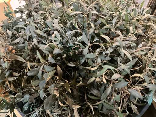 Houten voet, ronde schaal met kunststof plant (olijf)