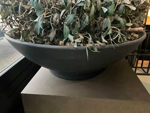 Houten voet, ronde schaal met kunststof plant (olijf)