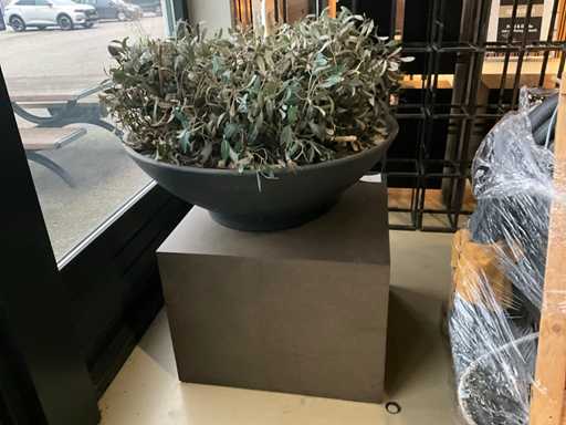 Kunst plant olijf met pot op presentatie kubus