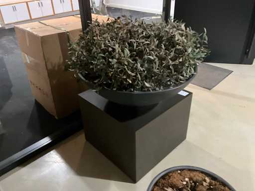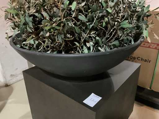 Houten voet, ronde schaal met kunststof plant (olijf)