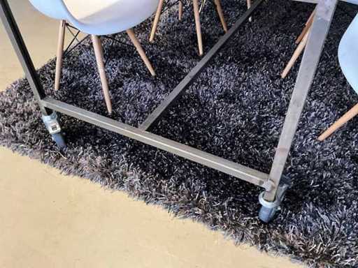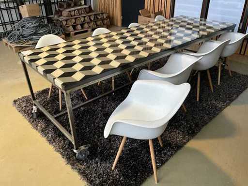 Handgemaakte tafel van DOKX op de Tramkade in Den Bosch, stalen frame op wielen, inclusief 8x stoel.