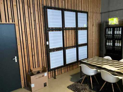 Stalen wand presentatie met 8x lichtbord 635x635, 230V.