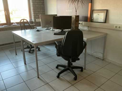 2x hoekbureau blad 180x120 cm; 2x bureaustoel; 1x metalen archiefkast 80x38x177; 1x ladenblok; 1x schuifdeurkast; zonder it apparatuur