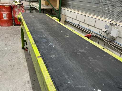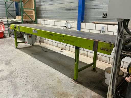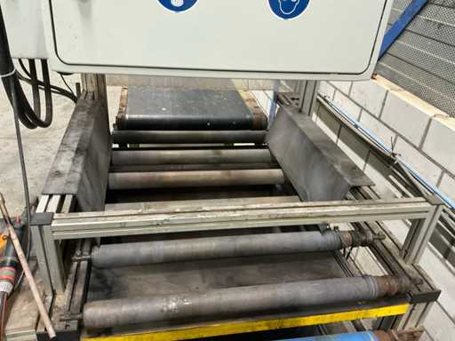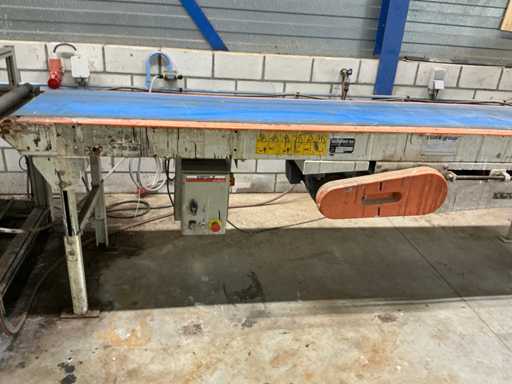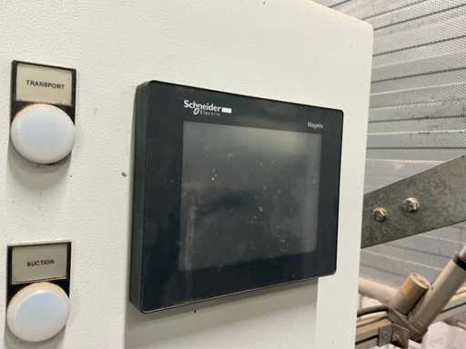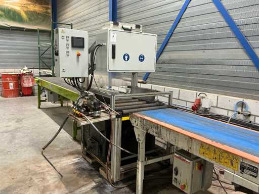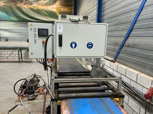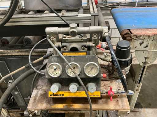 Machine voorzien van Wagner pneumatische pomp; Schneider digitaal bedieningspaneel; complete lijn met aanvoer transportband 3020x620 mm; afvoer transportband 3600x700 mm