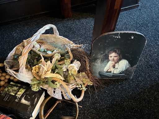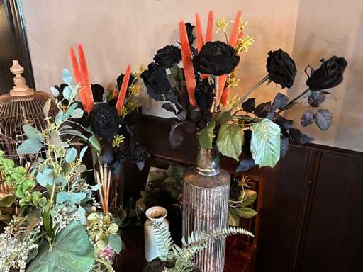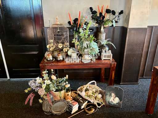 Deze partij bestaat uit kunstbloemen, vazen, een vogelkooi en overig decoratiemateriaal.