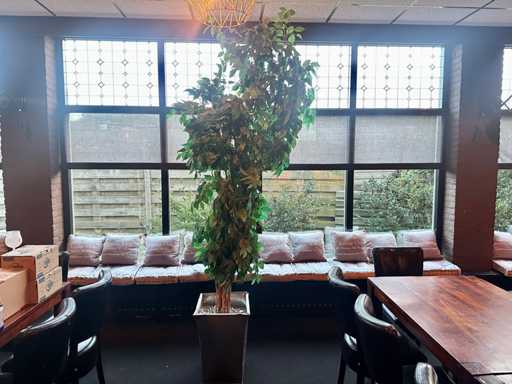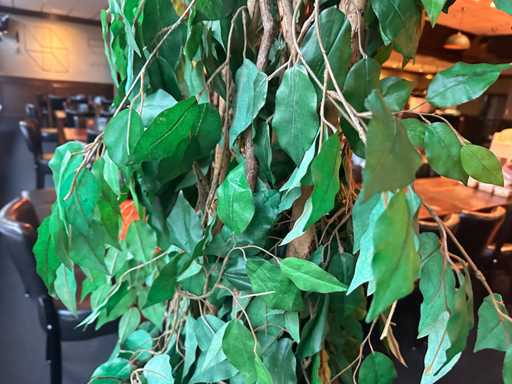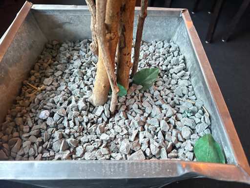 Deze kunst Ficus zit in een zware metalen pot met grind.