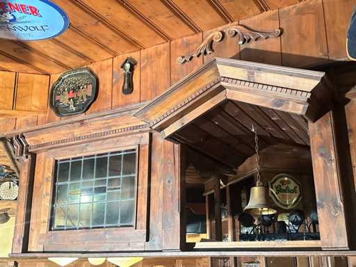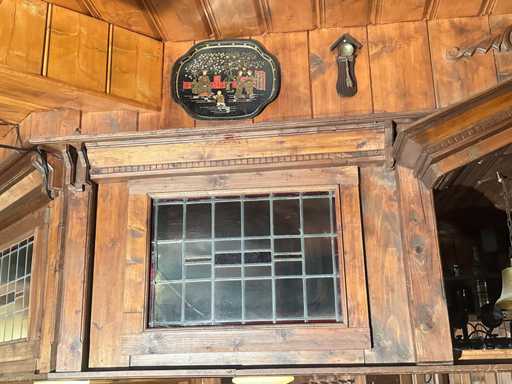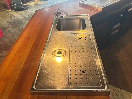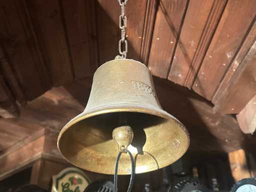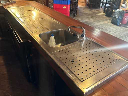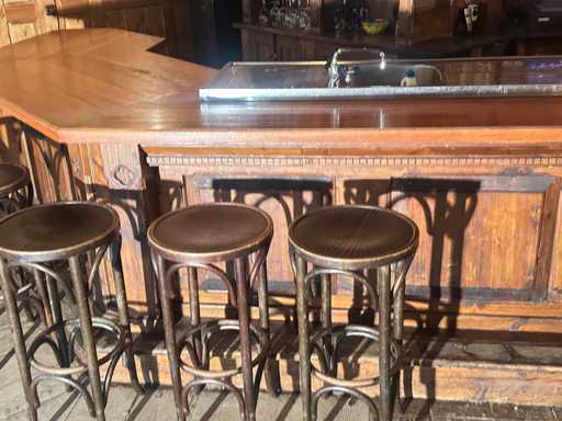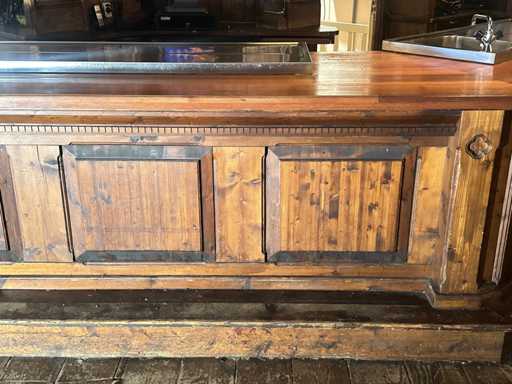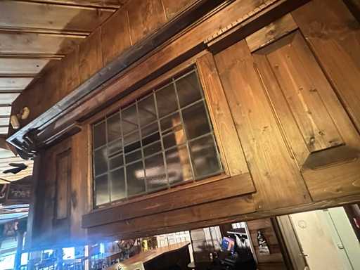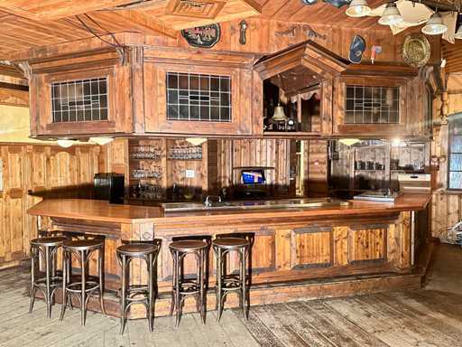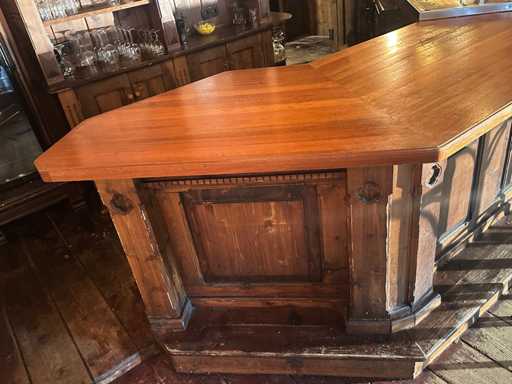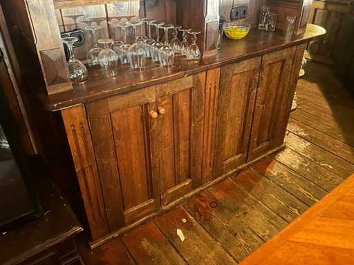 Deze rustieke volledige cafébar bestaat uit een bar, bovenbouw en achterkast. De afmeting van de bar is 490x460x105 cm. De kast heeft een afmeting van 170x60x 285 cm. Exclusief barkoeling en kassasysteem. Inclusief antieke scheepsbel.