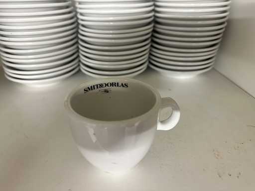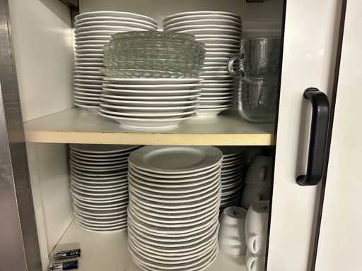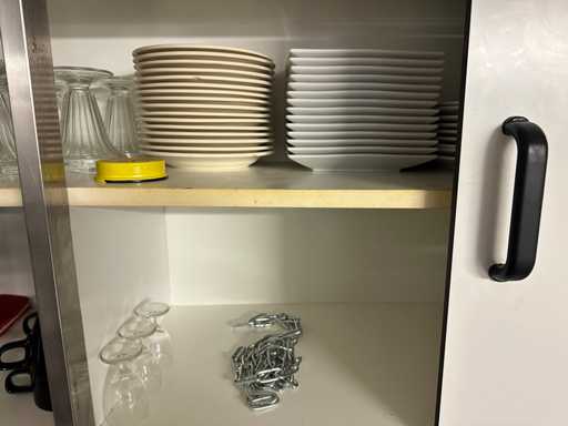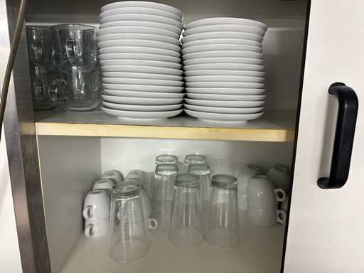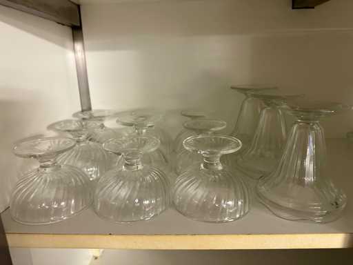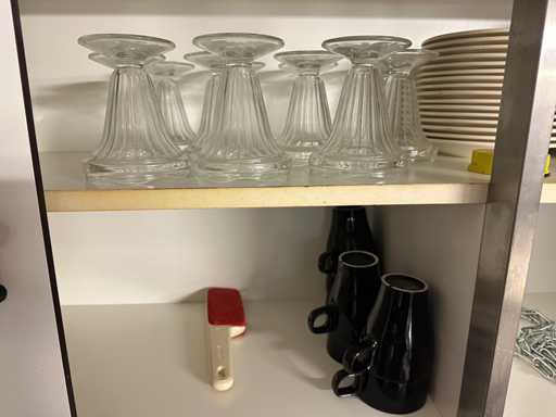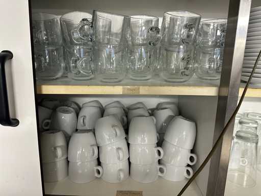 Deze partij staat in de wandkast met schuifdeuren in de keuken en bestaat uit koffieservies, theeglazen en dessertcoupes.